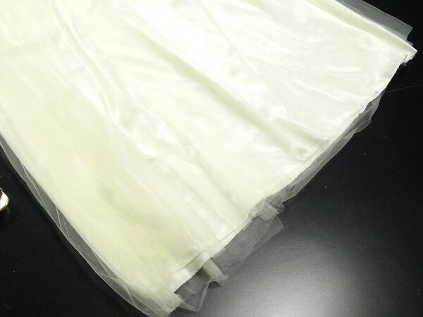 刺繍とチュールのウエディングドレス。デコルテラインは襟元にレースをめぐらしたチュール仕様。スカート部分は艶のあるクリーム色のサテン地にチュールをかぶせていて、ウエストのリボンがアクセントになっています。シンプルなウエディングドレスを希望される方には最適なデザイン。他、パーティやイベント、結婚式の二次会など、様々なシーンで、気品のある印象を与えてくれる一着です。裏地有。背中網掛け。背中腰から下ファスナ-有。胸パット付。