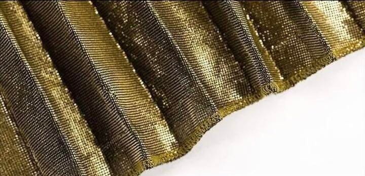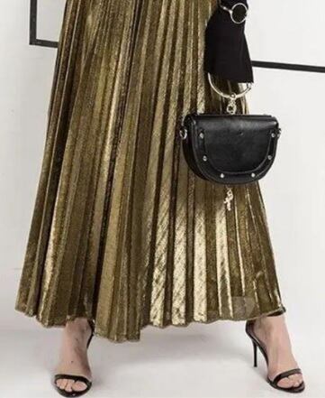 光沢メタリックゴ-ルドロングプリ-ツスカ-トです。しわになりにくく動くたびに揺れるエレガントなプリ-ツスカ-トです。ファスナ-なし(ウエストゴム仕様)。裏地あり。
