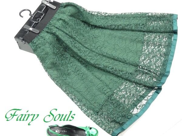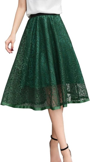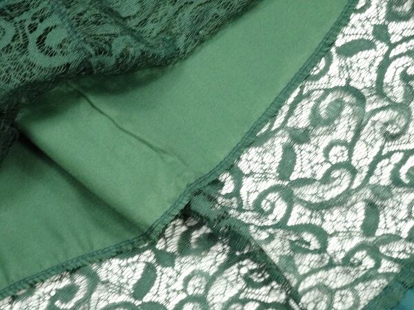 レース膝丈フレア-スカ-ト。深い緑のレースが美しくエレガントで揺れ感が素敵な一着です。ウエストは総ゴムでサイズ的にゆったり着用いただけます。裏地有。ファスナ-なし。