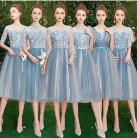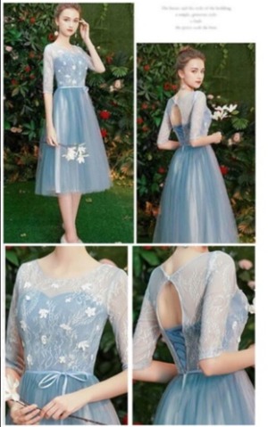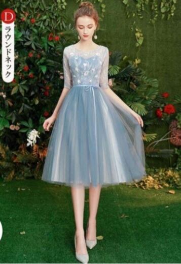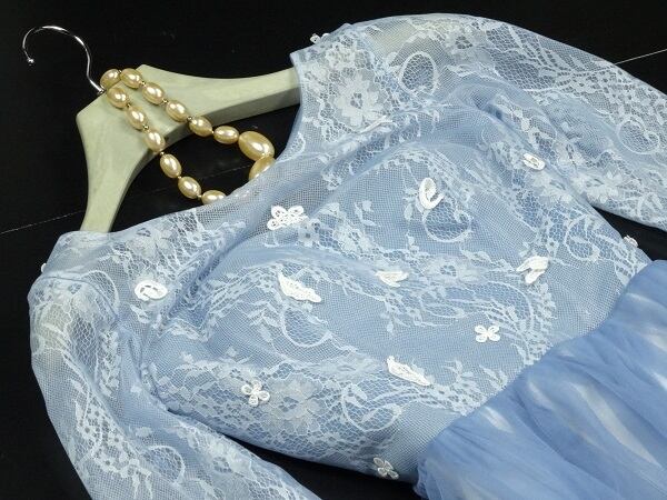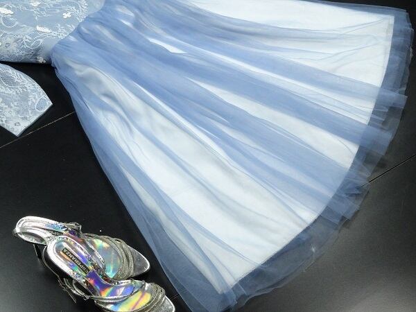 刺繍チュールのパ-ティ-ミディアムドレスです。トップス部分に白糸の立体刺繍が施されていてとても豪華です。スカート部分は白色のサテン地の上に水色のチュールが重ねられ豪華かつエレガントな雰囲気に。パーティやイベント、結婚式など、様々なシーンで、気品のある印象を与えてくれる一枚です。背中腰から下ファスナ-有。(背中網掛け)。胸パット付。裏地有。