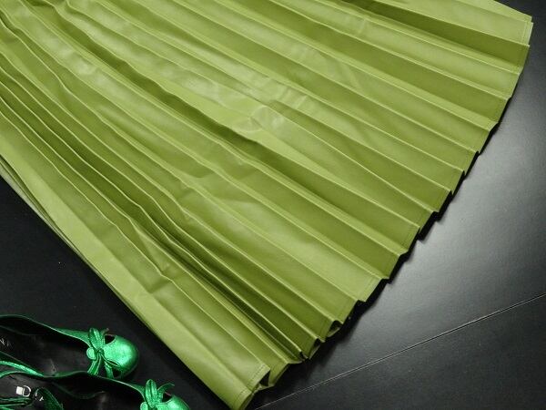エコレザーメタリック光沢プリ-ツスカ-トです。 とてもエレガントで柔らかいエコレザ-が使用され履きやすいスカ-トです。左サイドファスナー有。裏地なし。