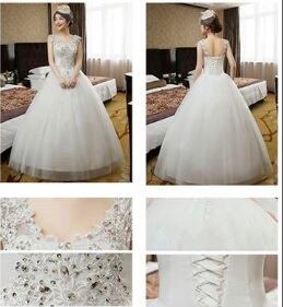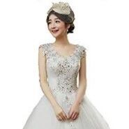 スパンコ-ル&ビジュ-飾りAラインウエディングドレスです。トップス部分はスパンコ-ル&ビジュ-がたくさん飾られキラキラ輝きとてもエレガントで豪華です。胸元からウエスト下にかけて綺麗なAラインに広がり豪華かつエレガントな雰囲気を醸し出しています。ウエディングドレスとしても、また、パーティやイベント、結婚式など、様々なシーンで、気品のある印象を与えてくれる一枚です。裏地付き。背中腰から下ファスナ-有。(背中編上げで結び紐有り)。胸パット付。背中編上げなので2~3cmのバストサイズの幅は結び具合により大丈夫です。