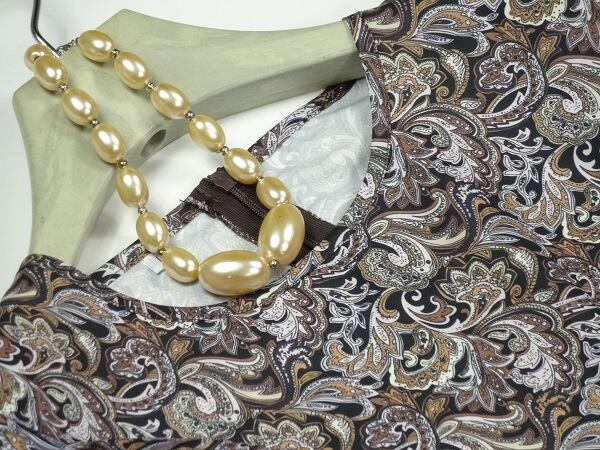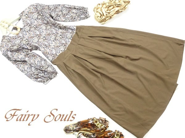 ペイズリ-柄ワンピースです。トップス部分はペイズリ-柄スカ-ト部分はブラウンの無地です。ふっくらとした袖で可愛らしさを演出した一着です。裏地なし。背中ファスナ-。裏地なし。