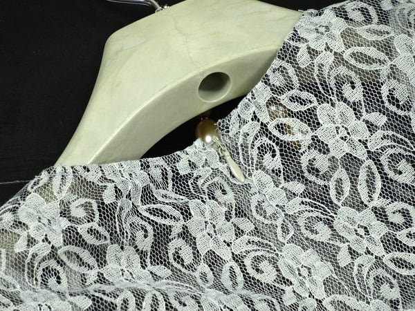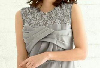 レースとドレープのワンピ-ス。胸元は透け感のあるレース仕様。ウエストには左右からドレープを中央で重ねて女性らしさを演出。ちょっとしたオシャレ着にも。またパーティや結婚式などフォーマルなシーンでも活躍してくれる一着です。裏地あり。背中ファスナー。