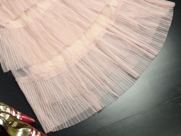 チュ-ルのレイアードロングスカ-ト。ピンク系のチュールを3段に重ねて、柔らかな揺れ感が魅力的なデザイン。履くだけで引き立つとてもファミニンなスカ-トです。ウエストゴム仕様でサイズにゆとりをもって着用いただけます。ファスナ-なし。裏地付。