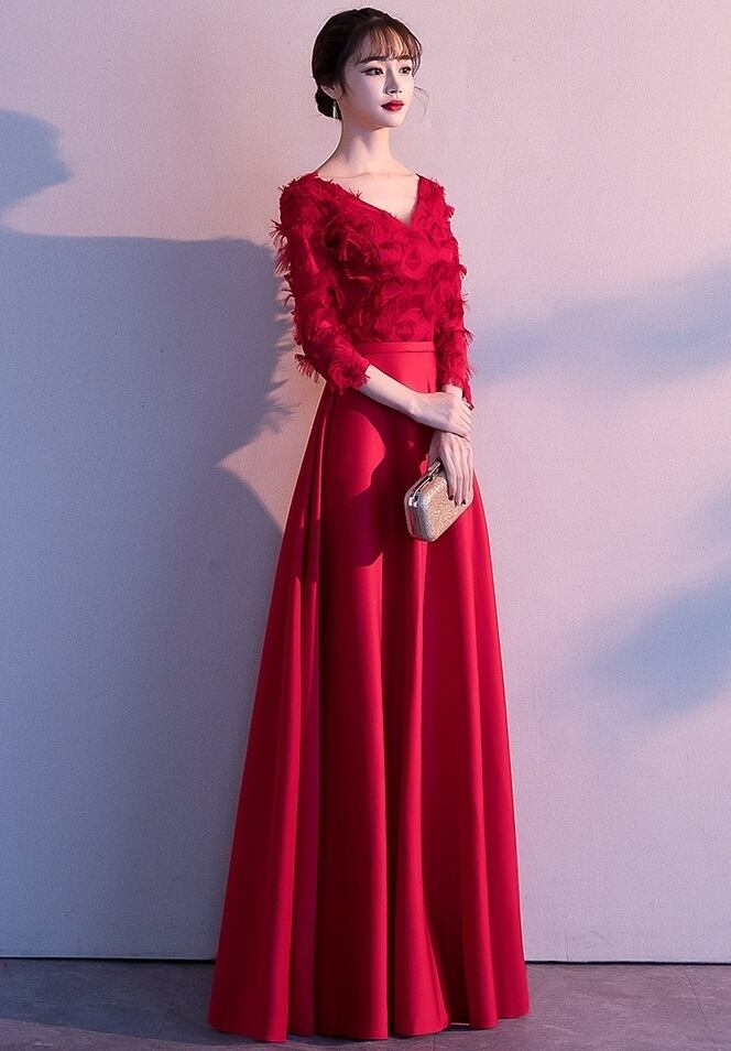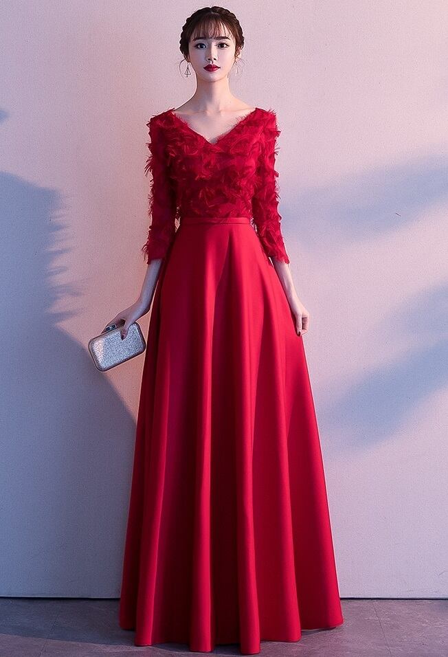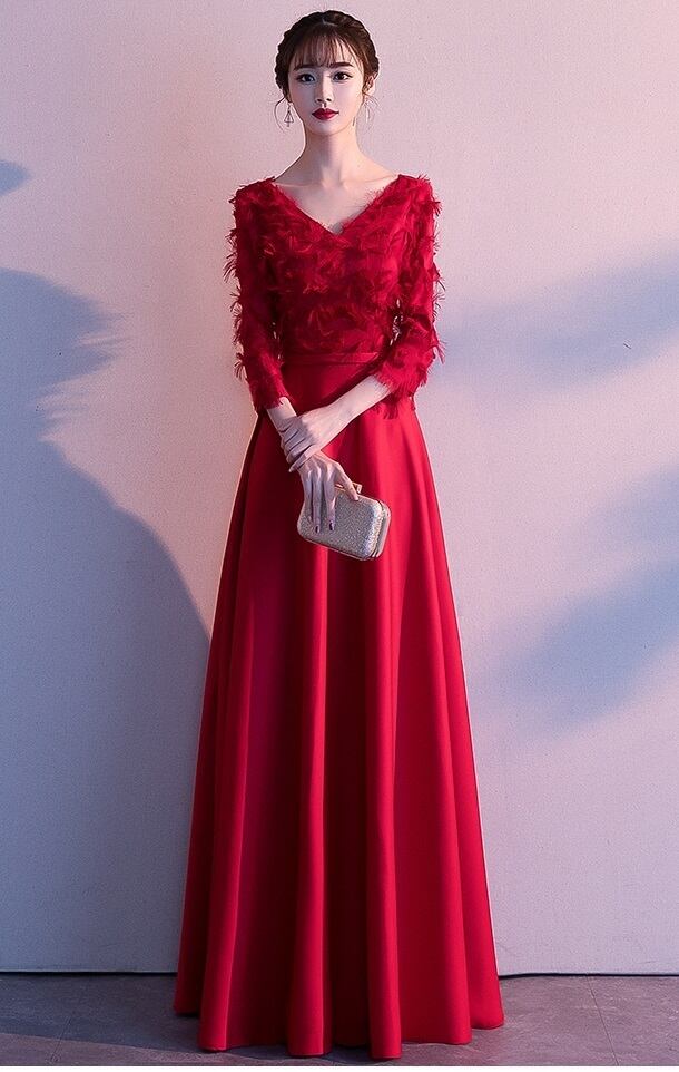 VネックAラインパーティ-ロングドレスです。トップス部分は細く長く刺繍され羽毛を覆っているようなデザインでAラインがとても綺麗なスタイルを醸し出してくれています。全体的に優しい感じに仕上げられています。背中ファスナ-有。裏地なし。