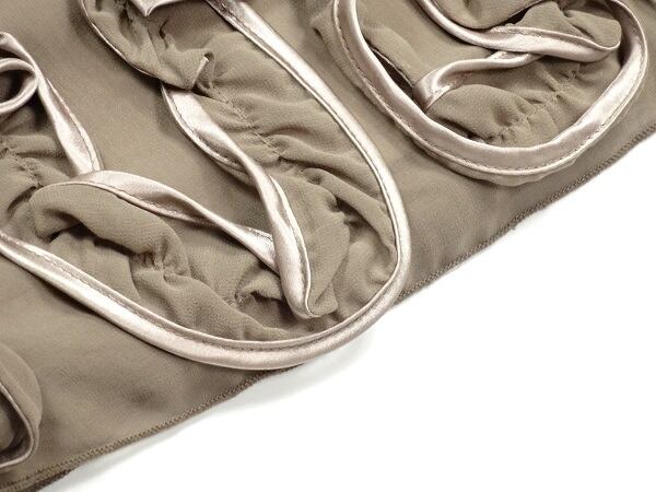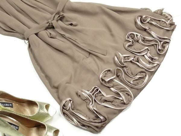 裾フリル飾りがかわいいシフォンのバルンミニドレス。胸元には縦に幅広タックをとり、裾はバルーン仕様で、ウエストから裾にかけて、ぷっくらとしたフォルムとウエストのリボン、裾のフリル飾りがキュートさをアップしてくれています。ファスナーなし。裏地有り。