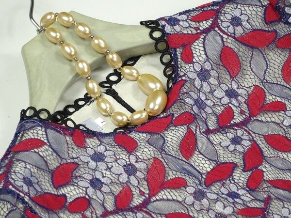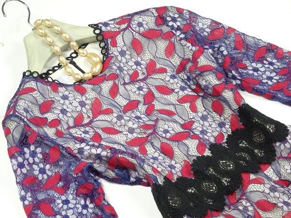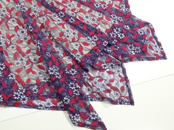 花柄レ-スアンシンメトリーワンピースです。落ち着いた赤と紺系のレースをたっぷりと使用。裾はランダムカットのアンシンメトリータイプで揺れ感がとても良いです。デート、お呼ばれ、パーティ、コンサート、結婚式にと、さまざまなシーンに活躍してくれます。背中ファスナ-有。裏地あり。