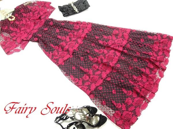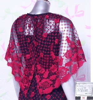 花刺繍チュールレースのワンピース。黒のチュール地に鮮やかな赤の糸で花模様を刺繍した情熱的な大人の女性感が表現されたワンピ-スです。袖はノースリーブ。胸元から腕をカバーするチュールがエレガント。背中ファスナー有。裏地有。