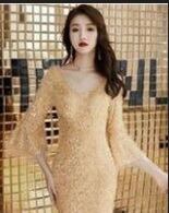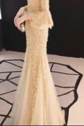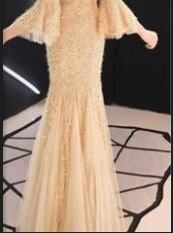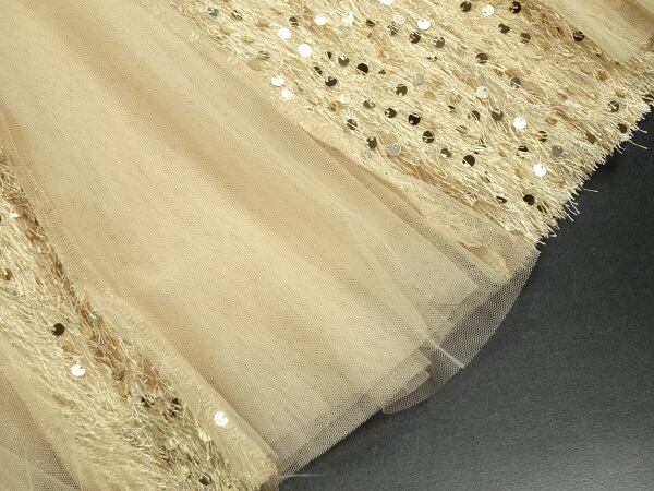 フェザーとスパンコールのロングドレス。シックなベージュ地にフェザーとスパンコールをちりばめた豪華な仕様。裾は間にシフォンをはさみ、袖は先を広げ、背中はVの字に開けて優雅でセクシーなデザインとなっており、高級感を醸しだしてくれています。パーティやライブ、イベント、結婚式など、どんなシーンでも活躍してくれる一着です。右脇下ファスナー有。裏地有。胸パット付き。
