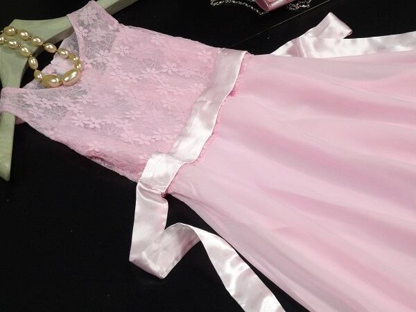 花柄レースのマキシ丈ワンピ-ス。上半身は花模様のレース仕立て。下半身はしなやかなシフォンをたっぷりと使用し、美しく大人の女性を醸し出してくれるエレガントなデザインになっています。かわいく品の良いとても魅力的な一着です。全体的に優しい感じに仕上げられています。ウエストのサテンリボンは取り外し不可。裏地有。背中ファスナ-有。