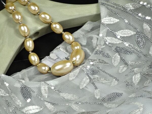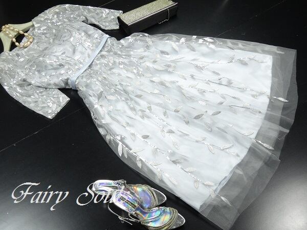 刺繍レースパーティ-ミディアムドレスです。袖やデコルテの透け感がとても美しく大人の女性を醸し出してくれるエレガントなドレスです。全体にシルバ-の刺繍とビジュ-飾りが施されデザイン性のあるスタイルがとても魅力的な一着です。全体的に優しい感じに仕上げられています。背中ファスナ-有。胸パット付き。