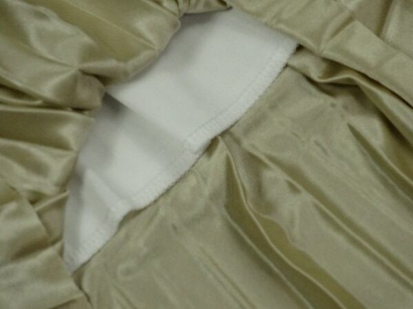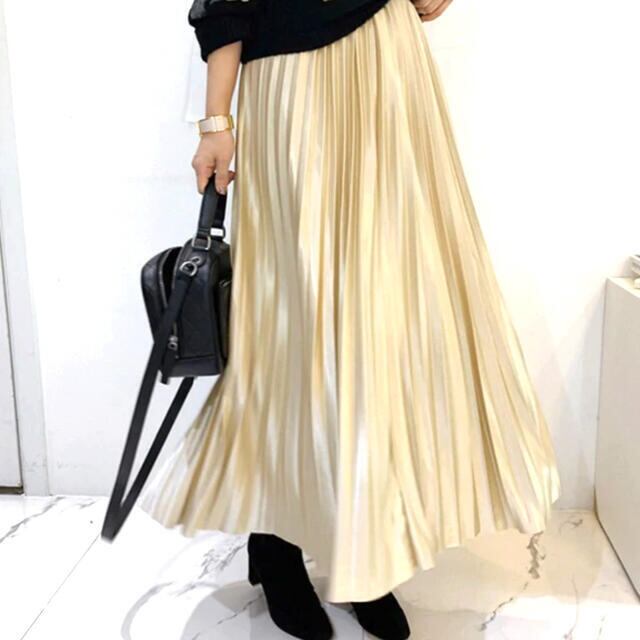 光沢ロングプリ-ツスカ-トです。動くたびに揺れるエレガントなプリ-ツスカ-トです。ファスナ-なし(ウエストゴム仕様)。裏地有。