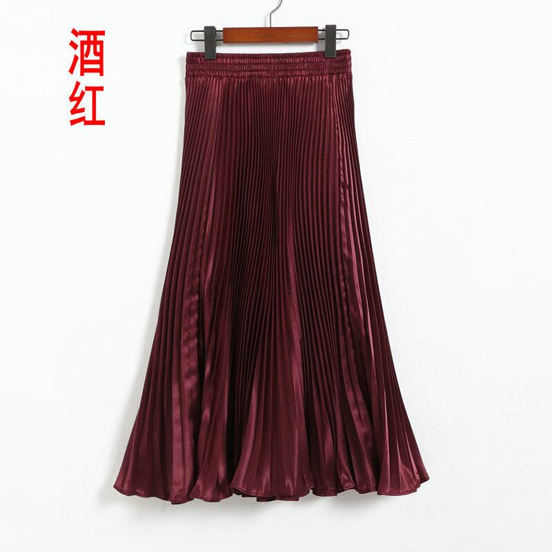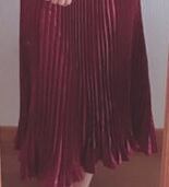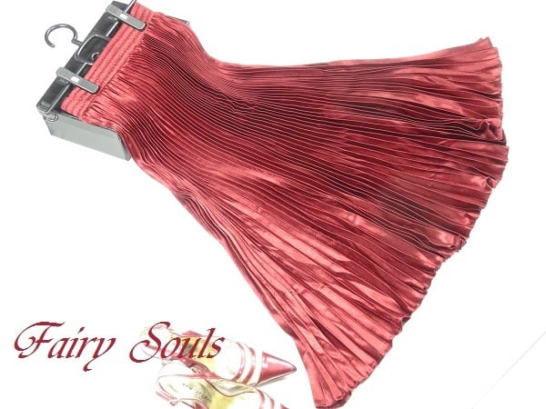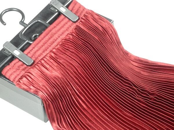 光沢メタリックワインレッドロングプリ-ツスカ-トです。しわになりにくく動くたびに揺れるエレガントなプリ-ツスカ-トです。ファスナ-なし(ウエストゴム仕様)。裏地なし。