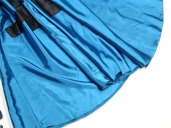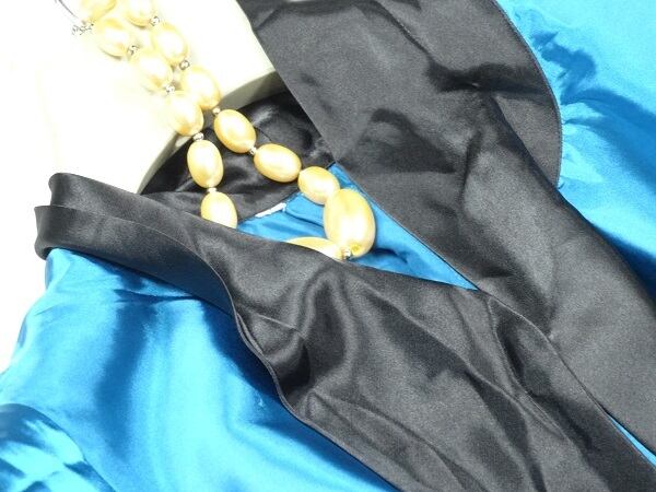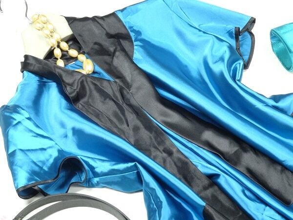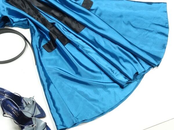 サテンのミニ丈ワンピ-ス。艶やかなコバルトブルーのサテン地に黒のサテンのリボンをアクセントにした華やかな一着。胸元から裾にかけてたっぷりと生地を使い、ゆったりと広がった形になっているので、そのままでも、またベルトきゅっと絞ってスレンダーに着こなしても。袖の後ろの方のデザインも変わっていて素敵です。裏地なし。ファスナーなしのかぶるタイプ。黒のベルト付き。