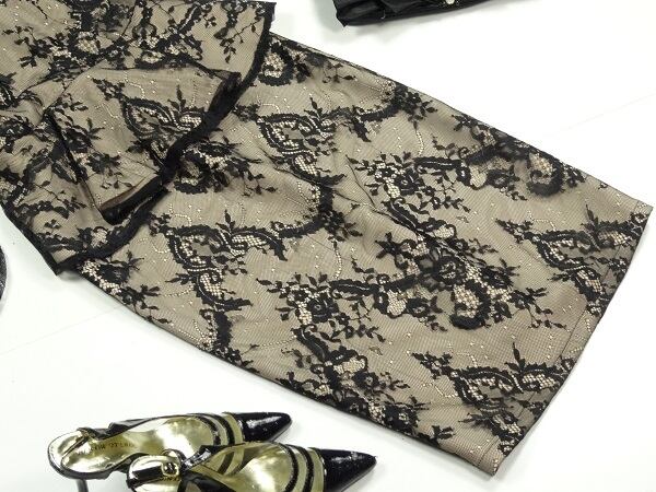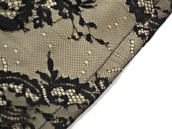 ペプラム仕様レースのスーツ風ワンピ-ス。やわらかなベージュのジャージ生地の上に、黒のレースをかぶせ、ウエスト周りはペプラム仕様で体型をカバ-してくれます。デコルテラインと腕の透け感がセクシーで大人の女性を思わせるデザインになっています。背中ファスナ-有。裏地つき。胸パッド付。