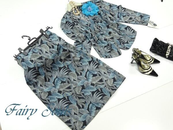 シックな花柄のエレガントなジャケットとスカートのセット。ジャケットの胸回り花飾りがアクセントとなっています。ジャケットはしなやかな生地でブラウス感覚で着て頂けます。スカートは後ろ裾にスリットを入れ、シンプルでエレガントなライン。上品で優しい大人の女性を表現してくれる一着です。スカートは後ろファスナー有。裏地付き。胸元のコサージュは取り外し可。