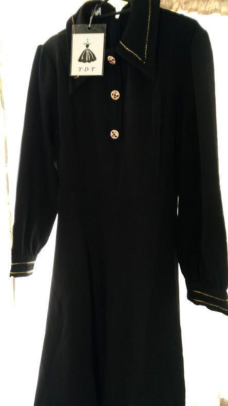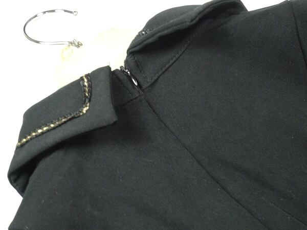 クラシックフォーマルなロング丈のワンピ-ス。しっかりとした黒の生地に襟元、袖先、胸元のボタンのゴールドを配し、シックで上品な印象の中に華やかさをプラスしています。フェミニンでやさしくエレガントな一着です。背中ファスナー。裏地なし。ベルト付き。