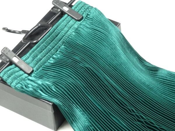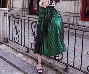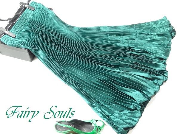 光沢メタリックグリ-ンロングプリ-ツスカ-トです。しわになりにくく動くたびに揺れるエレガントなプリ-ツスカ-トです。ファスナ-なし(ウエストゴム仕様)。裏地なし。