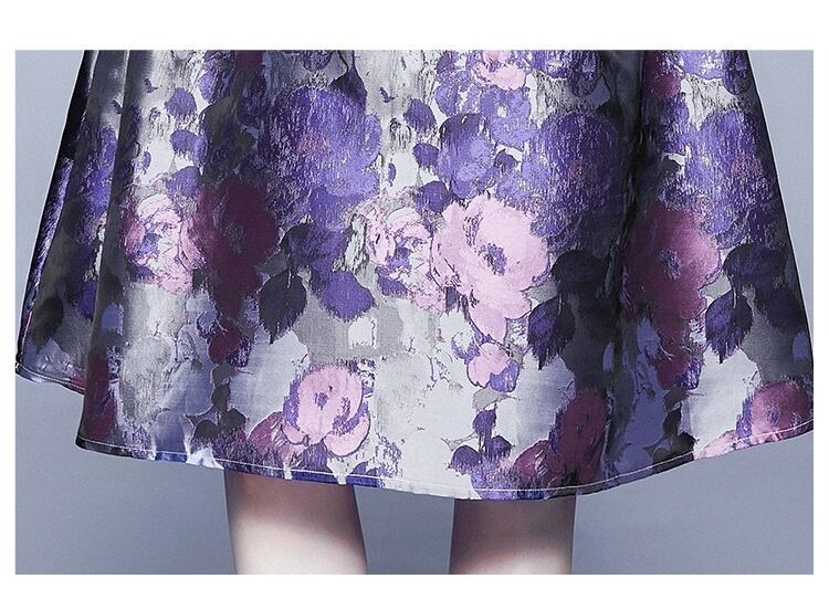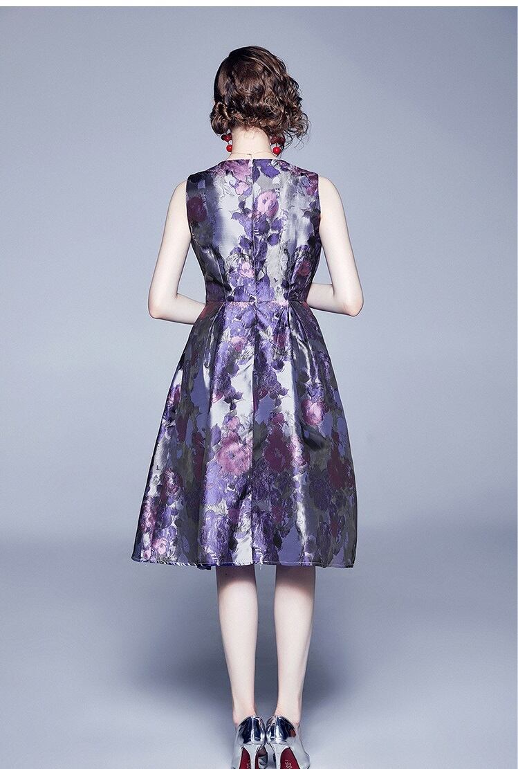 花柄ジャガ-ド織ミディアムドレスです。ジャガ-ド織花柄刺繍がとても上品かつ豪華で飽きのこない着まわせる一着です。紫と赤紫とシルバ-のコントラストがとても綺麗で大人の女性度をUPしてくれてます。裏地有。背中ファスナ-有。