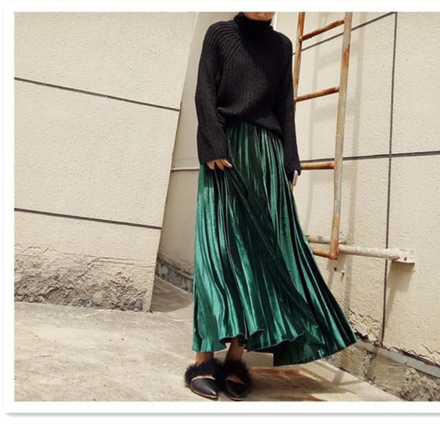 光沢ベルベットグリ-ンプリ-ツスカ-トです。動くたびに揺れるエレガントなプリ-ツスカ-トです。ファスナ-なし(ウエストゴム仕様)。裏地なし。