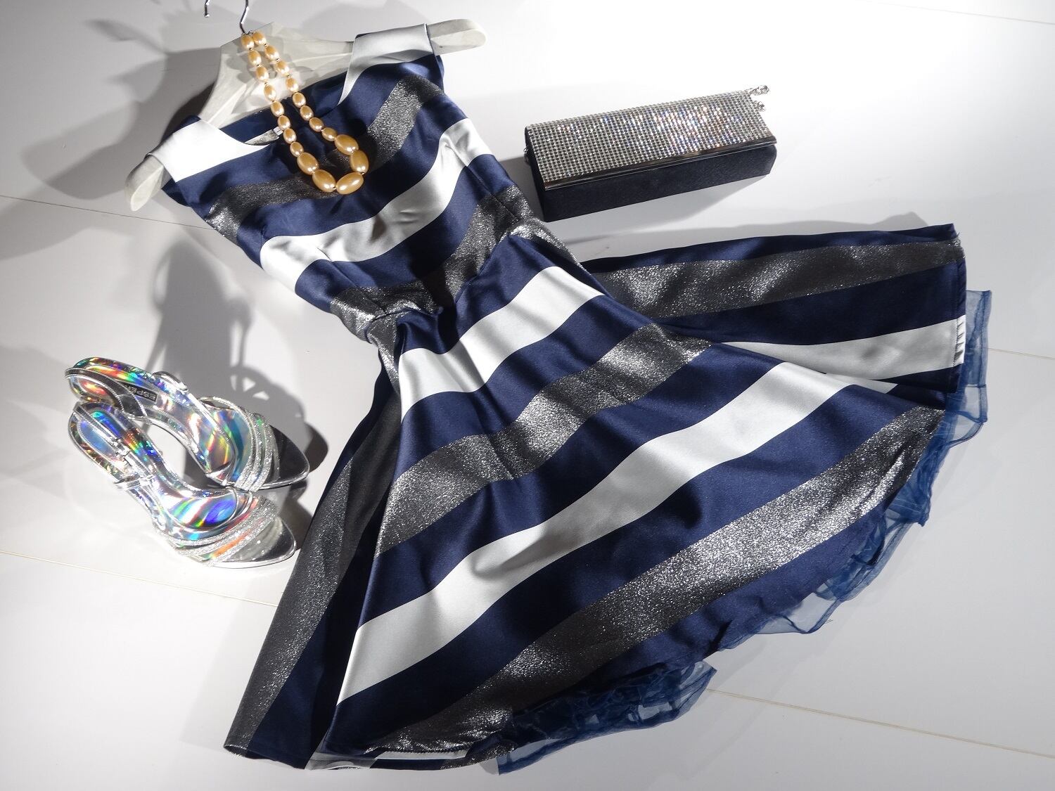 人気のAラインのボーダ-ドレスワンピ-スです。大人っぽい色合いで結婚式やパ-ティ-にもお薦めの一着です。背中ファスナー有。裏地有。