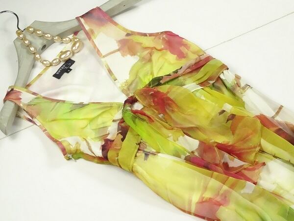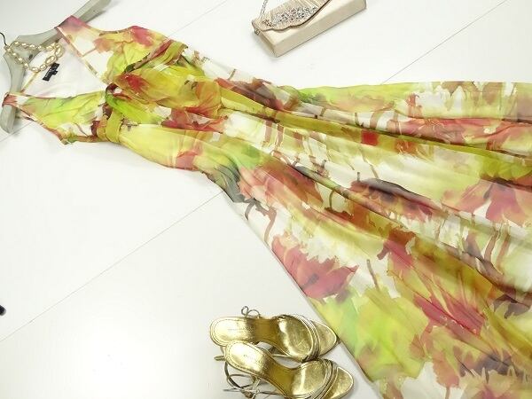 しなやかなシルク生地にカラフルなプリントがほどこされたマキシ丈ワンピース。胸元には丸いリングに幅広リボンがあしらわれています。 エレガントでキュート。魅力的なデザインです。11号表示ですが細めです。9号~11号位の方に。右脇ファスナー。裏地あり。