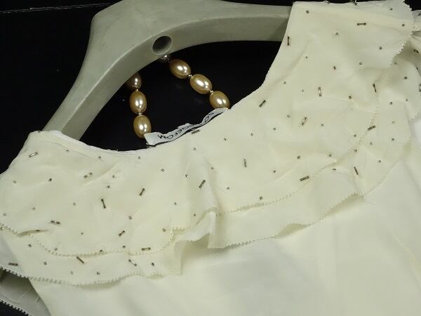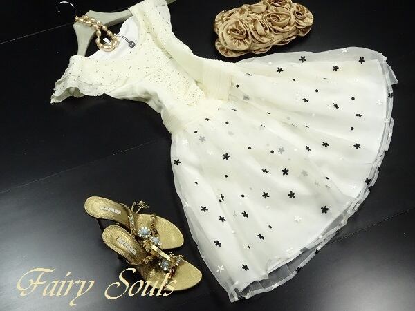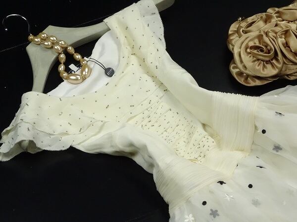 大きな丸襟と胸元にはビーズ飾り仕様。ウエストは細いタックが幾重にもとられ、スカート部分には大小の星形模様の刺繍がほどこされた上品なお嬢様テイストのワンピース。トップスとスカートの切り替えにウエストのタックがスパイスのように効いています。着心地の良い、上品な印象の一着です。ファスナーあり。裏地付。