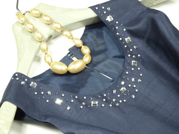 ビジュー飾りのワンピ-ス。落ち着いたネイビーのしっかりとした生地で、胸元にビジューをあしらった品良くエレガントさが際立ちとても美しく高級感を醸しだしてくれるデザイン。ちょっとおしゃれな普段着として、またフォーマルなシーンでも活躍してくれる一着です。裏地有。左脇ファスナー。ベルト付き