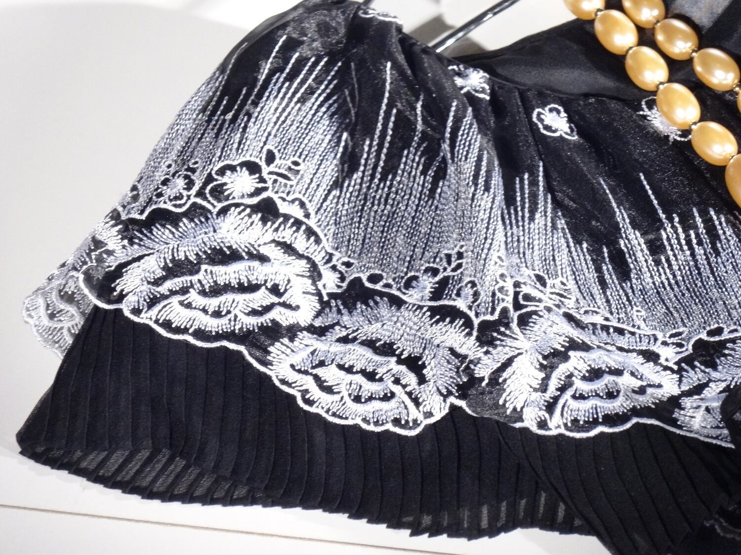 オーガンジー生地に艶やかな白の刺繍糸で花模様を刺繍したワンピース。大きな襟と裾に大胆な構図で華やかな刺繍が施されています。共布のウエストリボンベルトをきゅっとしめてクールな印象に。コート風デザインがユニークなゴージャスな一着です。共布ウエストリボンベルト付。左脇ファスナー。裏地あり。