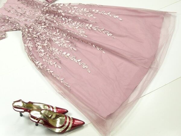 花柄立体刺繍上質フレア-ワンピースです。ピンク地に立体花刺繍をほどこしたチュ-ルが重ねられシックなデザインです。透け感がキュートなセクシー感を演出。優しい感じのワンピ-スです。右サイドファスナー有。裏地有。