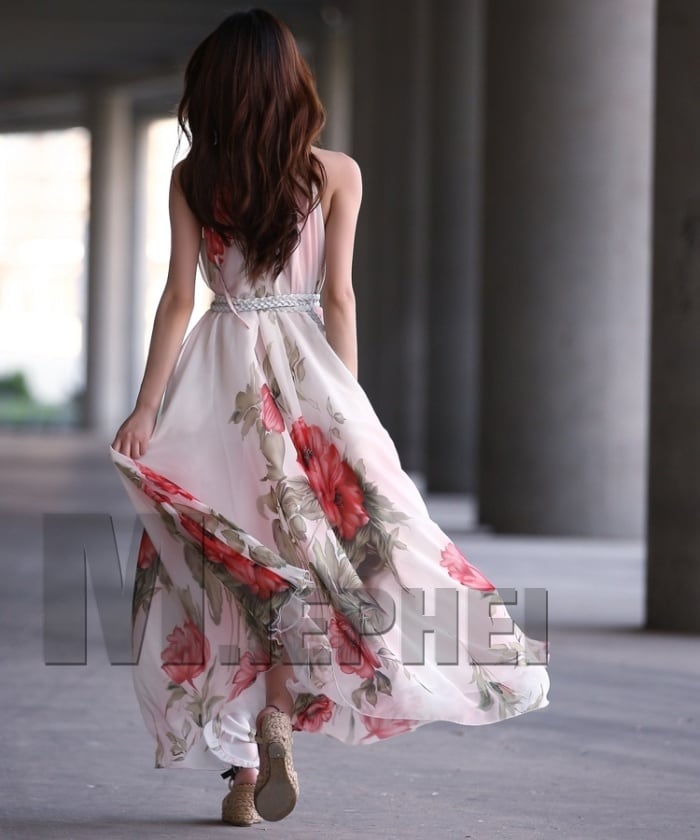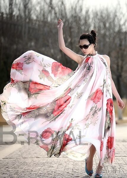 華やかで上品な花シフォンマキシ丈ワンピースです。全体に大きな花柄がプリントされたしなやかでやわらかな生地がたっぷりと使われています。裾は十分な生地を使用していますので、歩くたびになびき足の動きをキレイに見せてくれます。裏地付。