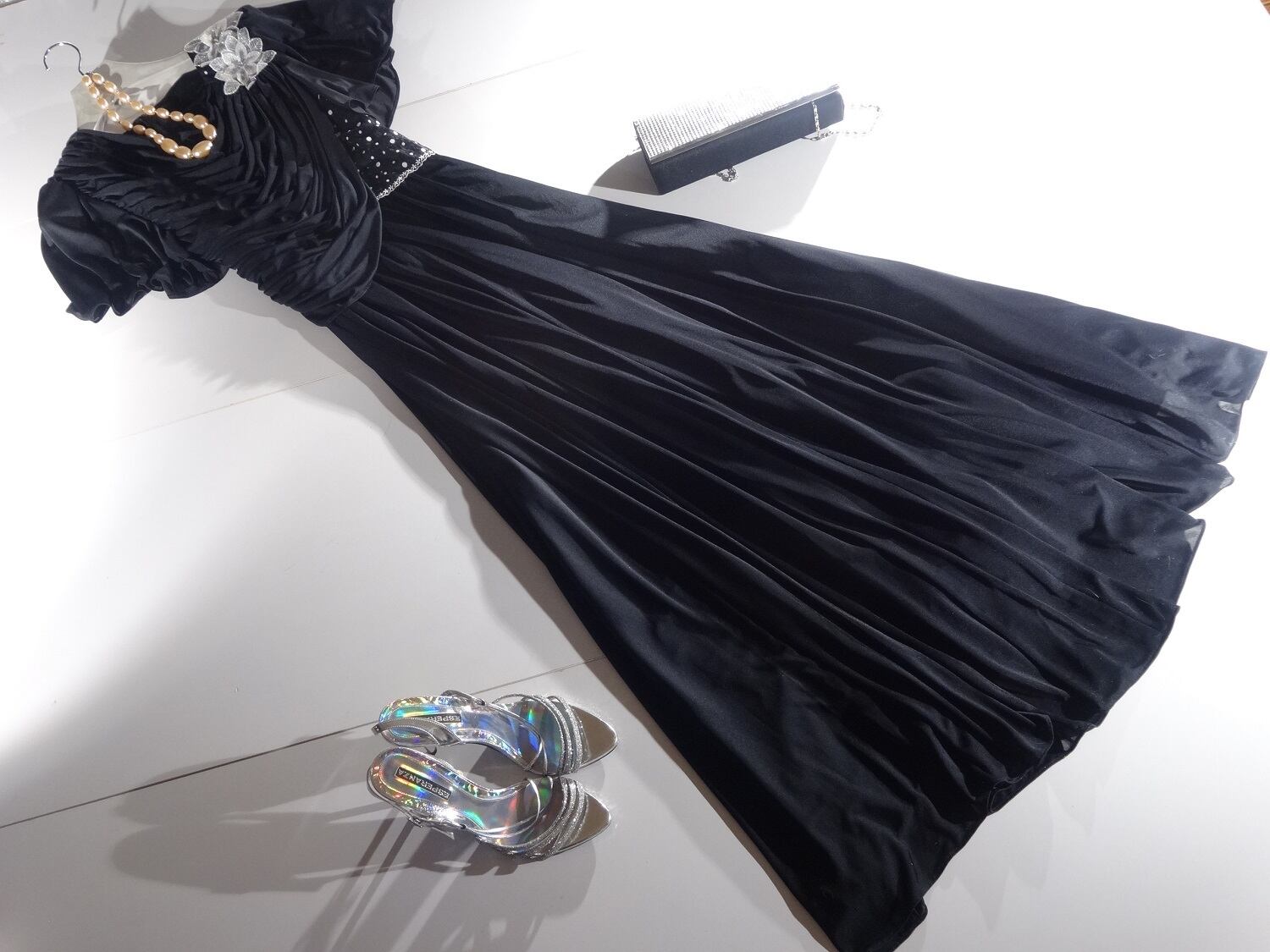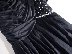 胸元のドレ-プがとても美しい女性らしいエレガントなデザインのロングドレスです。スカ-ト部分は流れるようなフレア-でとても優雅です。後ファスナー有。裏地有。