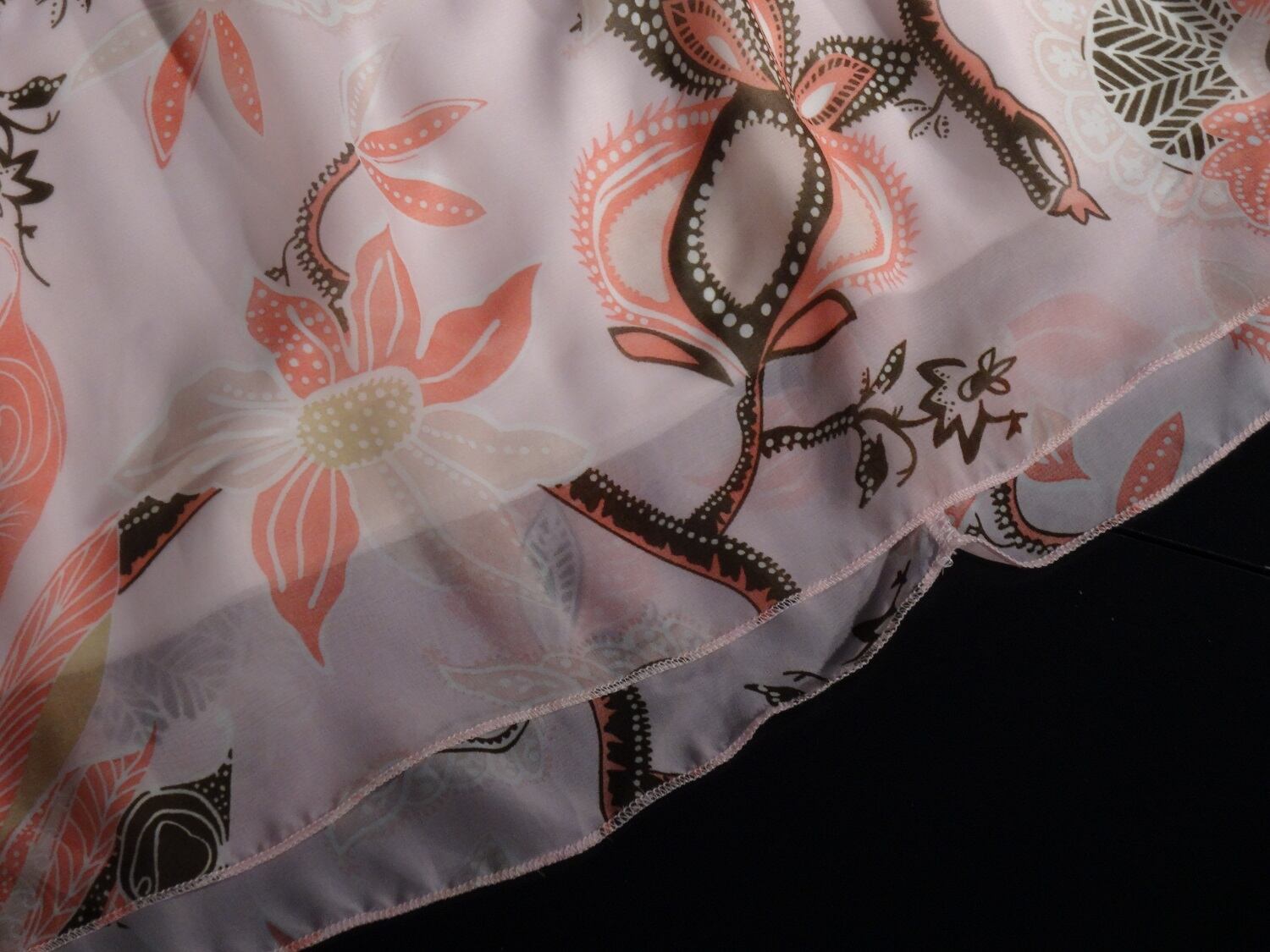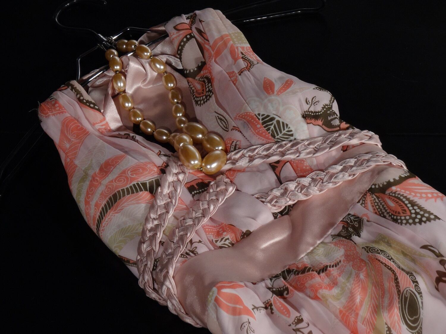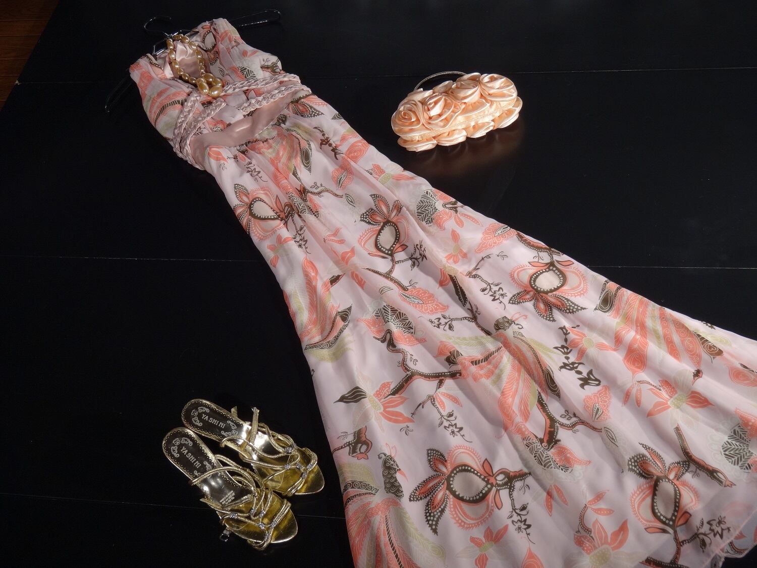 さわやかなピンクの生地に、花がプリントされたキュートでエレガントなロングドレスです。胸元はクロス編みになっています。。柔らかな柄、カラ-の華やかな一着です。可愛らしさと大人のエレガンスの両方を感じさせてくれるデザインです。裏地あり。