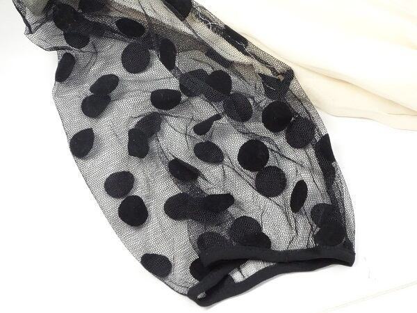 しなやかなベージュのシルク地に黒のドット柄がアクセントになっているキュートなワンピース。可愛い丸襟と袖、裾には黒のネット生地に黒のドット柄がデザインされていて、袖と裾は綺麗な透け感があります。ワンピースは2cm位のゆるいプリーツ仕様になっていて、ひもウエストベルトがついています。ピュアでフェミニンな印象の魅力的な一着です。ファスナーなしのかぶるタイプ。紐ベルト付。裏地あり。