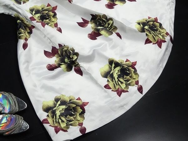 艶やかなサテン地のAラインフレアワンピース。襟もとは優しいカーブを描くラウンドネック。白地に渋めの色でプリントされた大きなバラの花がクラシックモダンな印象に。上品でおしゃれな一着です。背中ファスナー。裏地あり。