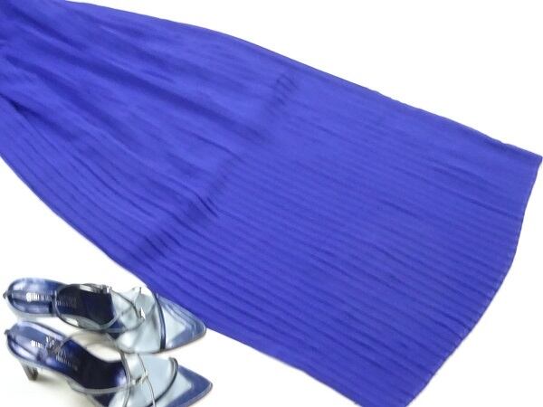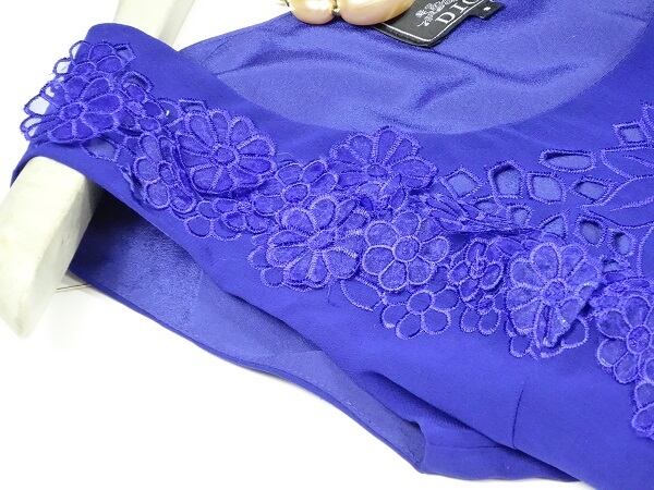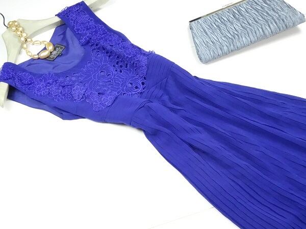 切抜き刺繍とモチーフ仕立てのプリーツロング丈のワンピ-ス。トップスには花柄の切抜きとモチーフが組み合わせてあしらわれ、ウエストから裾までは約1cm幅の細かなプリーツで、鮮やかな青が、エレガントで美しい一着です。裏地付。左脇ファスナ-有。
