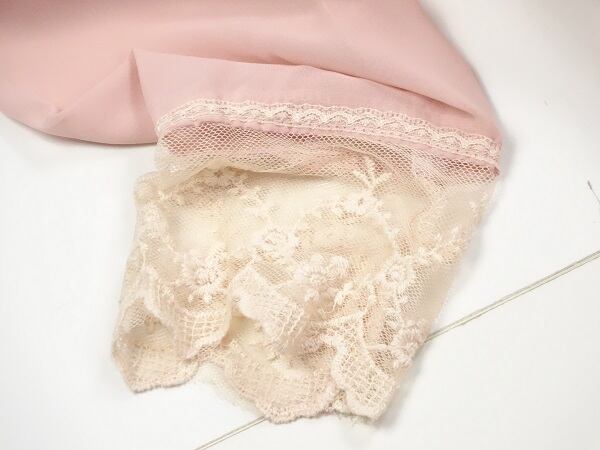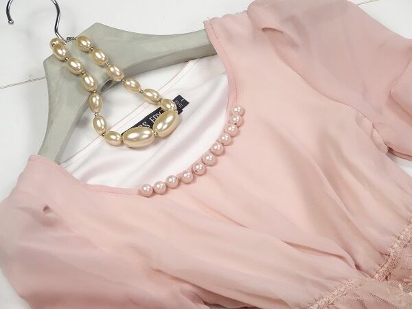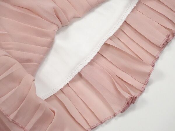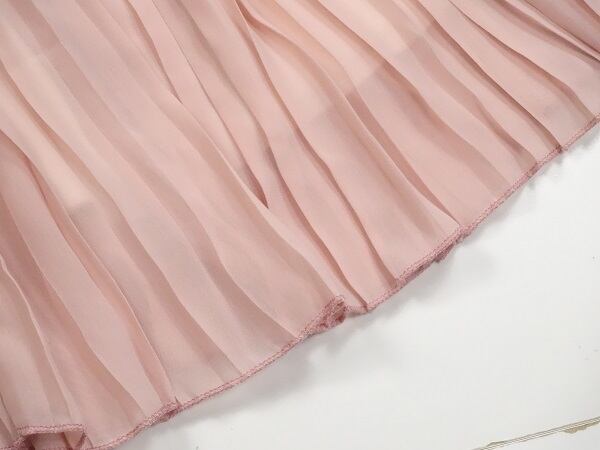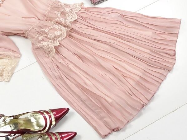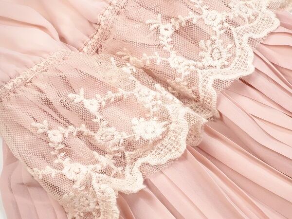 レ-スとパ-ルが上品なシフォンプリ-ツワンピ-スです。ウエスト部分はゴムになっているので程よくフィットしスタイルアップしてくれています。左脇ファスナー。裏地付。