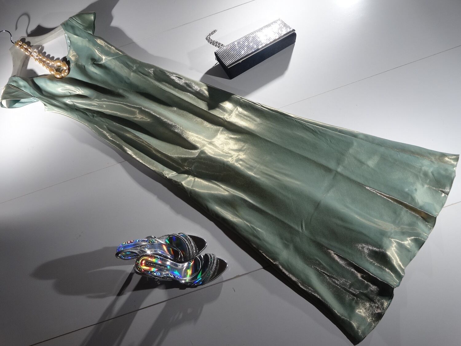 光沢のあるしなやかな生地のエレガントなオーガンジ-フォーマルドレスです。体のラインを美しく魅せてくれる品の良いドレスです。裏地あり。左サイドファスナ-有。