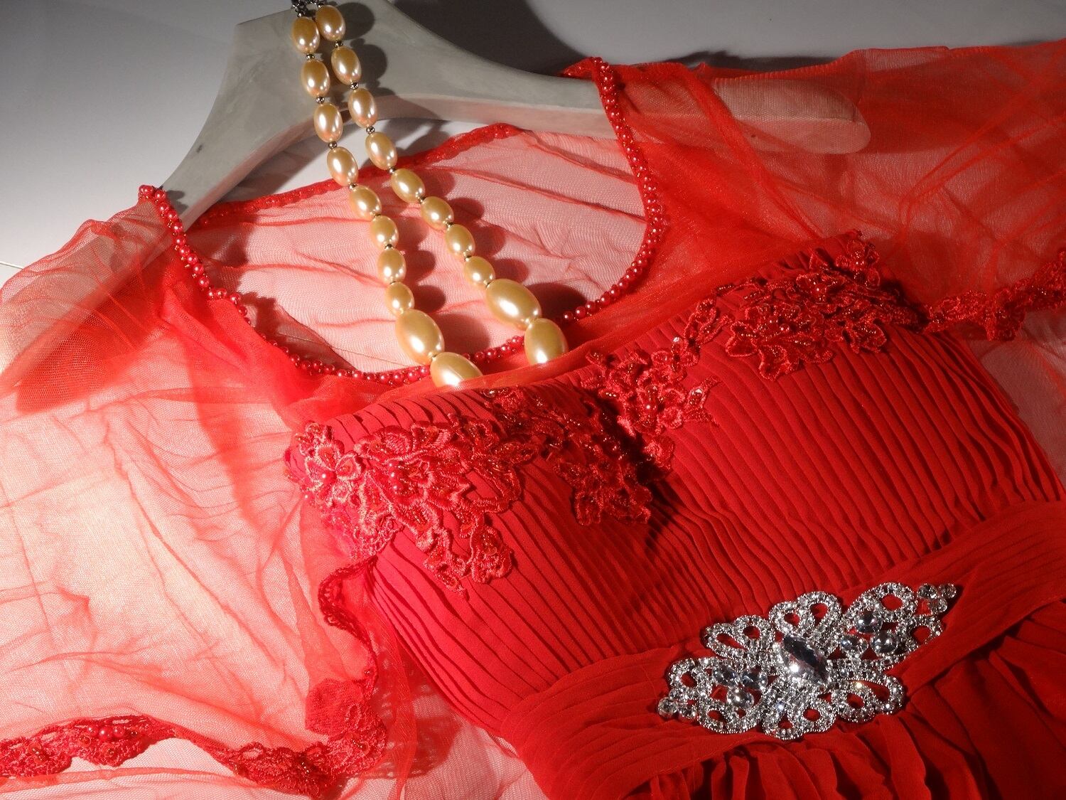 鮮やかな赤いドレスは注目の的、透け感のあるケ-プで全体的に柔らかでエレガントに仕上がっています。襟元の赤のビ-ズでお顔周りに華やかさを!胸元がプリ-ツになっていて刺繍が施されとても豪華です。ウエストの存在感のあるシルバ-モチ-フが全体をゴ-ジャスに魅せてくれます。背中シャ-リング左サイドファスナ-有。裏地有。