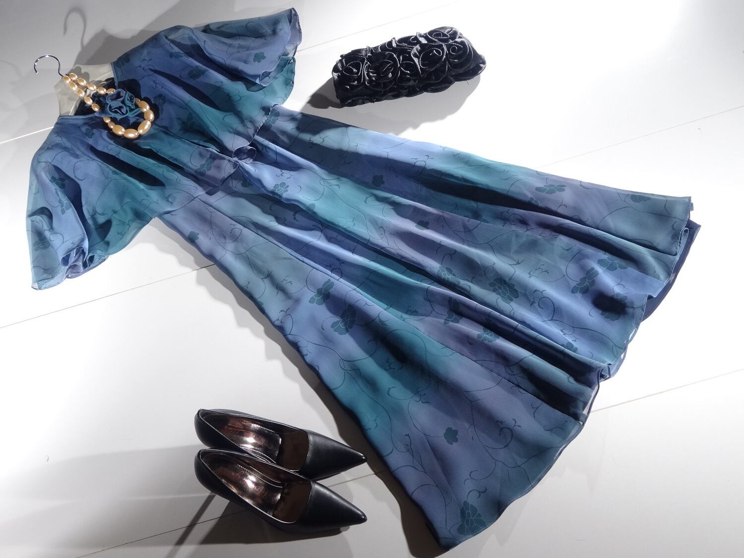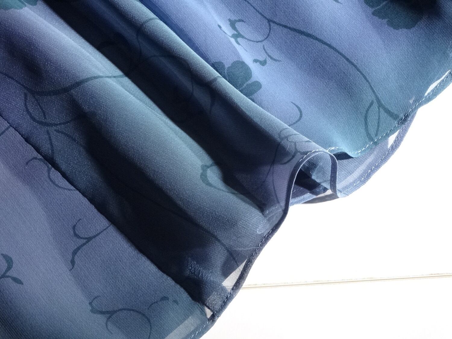 シックな花模様シフォンのロング丈ワンピース。トップス部分は、たっぷりとドレープに生地をとり、ゆったりとした袖は動くたびにひらひら優しく揺れ、二の腕をしっかりカバー。襟元中央の花モチーフがアクセントになっています。すこしマットな緑のグラデーションに花とつたの模様がプリントされ、かわいいシルエットにシックな色合いがユニークな印象を醸し出しています。インナーは艶やかなサテンの深いネイビーキャミソール。上品な一着です。背中ファスナー。インナー付。日本製。