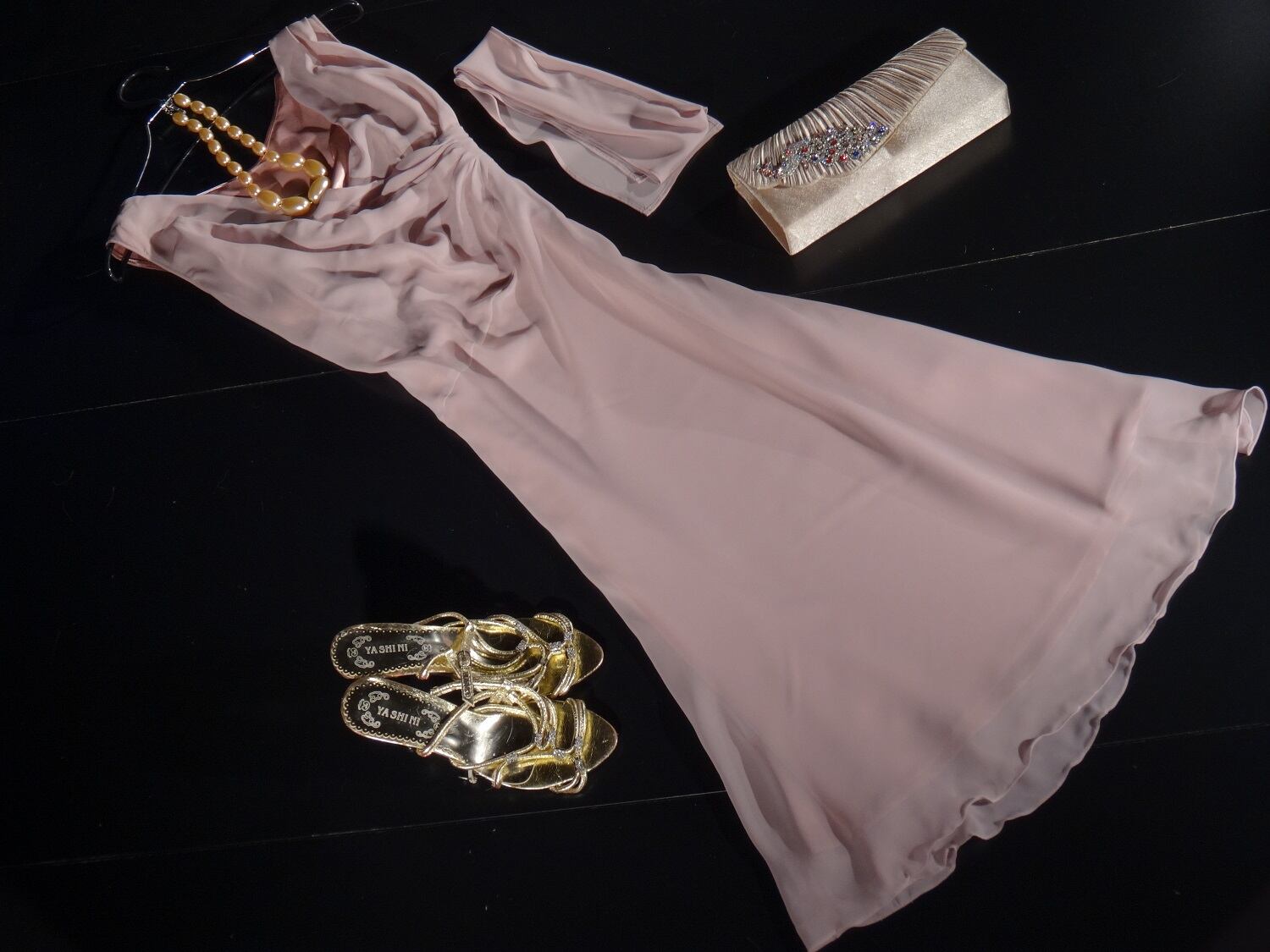 胸元のドレープがとてもセクシーなロング丈のワンピース。やわらかなピンクパープルが優しい印象で、しなやかな生地が女性らしいラインを引き出してくれる魅力的な一着です。共布リボンベルト付。サイドファスナー。裏地あり。