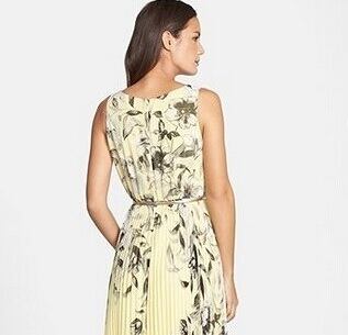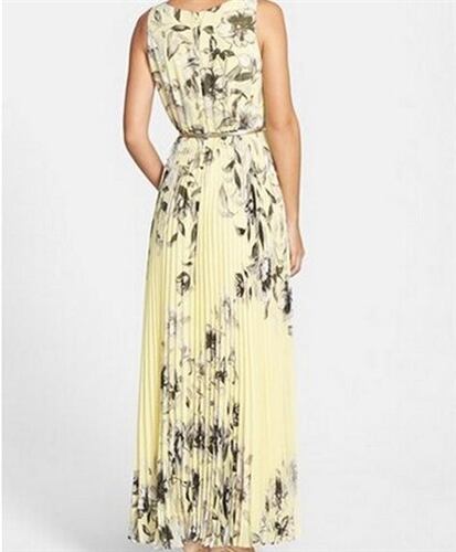 大きな花柄プリントプリ-ツマキシ丈ワンピースです。優しいイエロ-のシフォン生地にクラシカルな花柄がプリントされていて華やかな印象に。トップスはシンプルなノースリーブ。ウエストはすそにかけてプリ-ツになっています。軽くて着心地の良い一着です。ベルトは付いていません。背中ファスナー有。裏地あり。