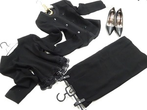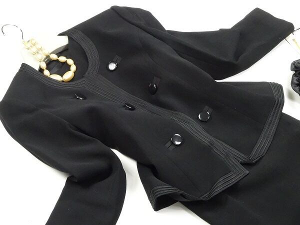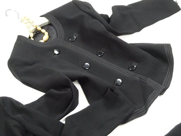 シックな黒のブラウス、ジャケット、スカートフォーマル3点セット。ジャケットは留め具なしの前を合わせるタイプ。襟ぐりから裾まで3本のラインが流れ、大きな黒のボタン飾りがあしらわれています。中には、裾にレース刺繍がほどこされたブラウスを組み合わせています。スカ-トはサイドがゴム仕様の後ろファスナ-。フォーマルに必須アイテムです。上下共裏地付。