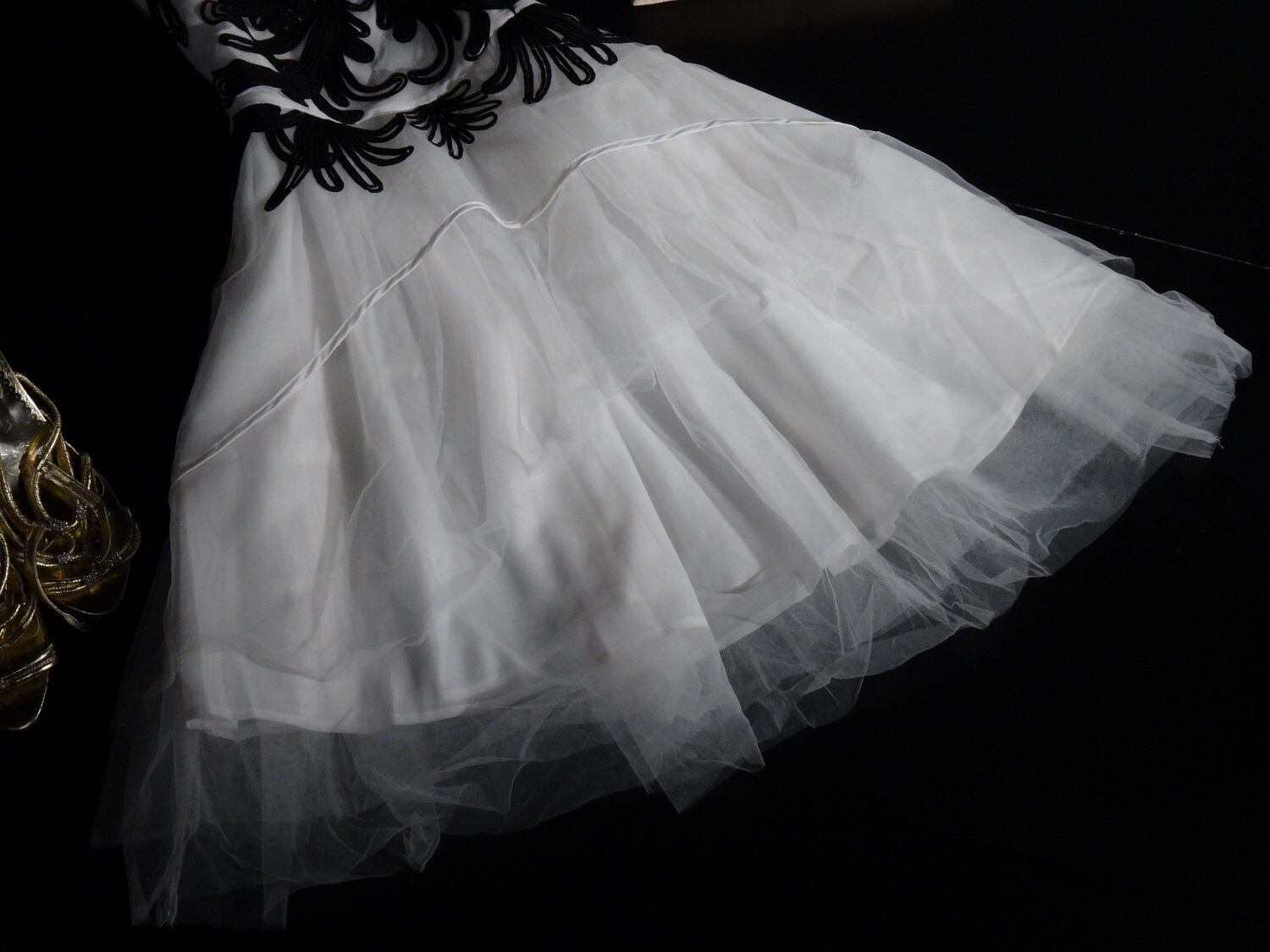 トップスの素敵な立体網状モチ-フがエレガントで上品な雰囲気を漂わせ、一気に華やぐ着映え力を発揮してくれ、大人の女性を魅力的に演出してくれる存在感ある一枚です。ボリュ-ムのあるスカ-トに重ねチュ-ル素材で仕上げられてふんわり膨らんだシルエットの完成です。裏地付。左側にファスナ-有。