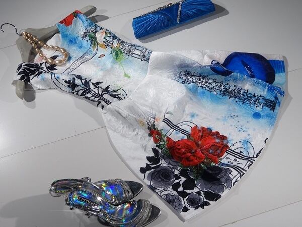 ブルーを基調とした花柄が美しいワンピース。白地に赤や青の花模様がプリントされていて全体を綺麗なバランスにまとめています。後ファスナー。裏地なし。