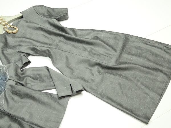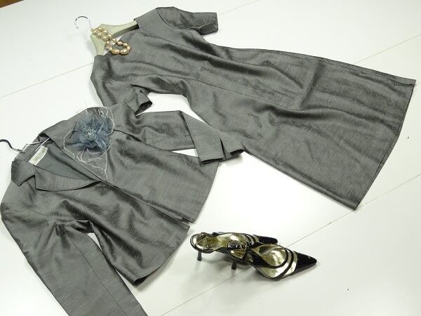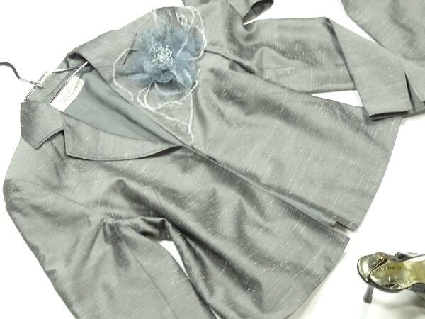 グレーのジャケットとワンピのセットアップ。ワンピース半袖のすっきりとした緩いAライン。ジャケットはテーラー型のシックな装い。フォーマルのシーンにぴったりのデザインになっています。シルエットも美しく、ワンランク上の大人の装いを演出してくれます。ワンピースは背中ファスナー有。スカートは左裾から上に16cmのスリット有。裏地あり。取り外し可能なコサ-ジュ付き。