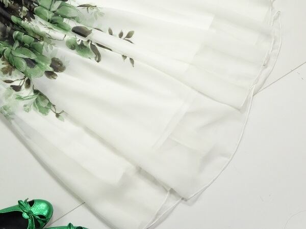 トップス部分は、オ-ガンジ-素材で仕上げられ、カラ-ビ-ズ&清楚な刺繍から女性らしさを引き出しフェミニンかつロマンティックな雰囲気醸し出してくれます。シフォン素材のフレア-スカ-ト部分には、爽やかなプリントが施されており、女性本来の柔らかさや優しいイメ-ジが伝わり、動くたびに揺れる気分がとても心地良いです。右側にファスナ-有。裏地あり。