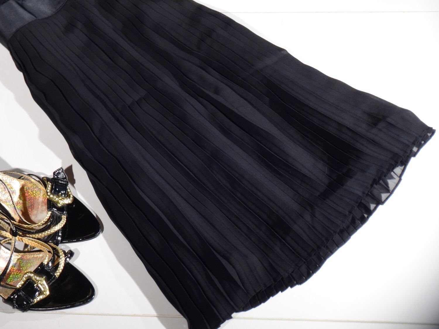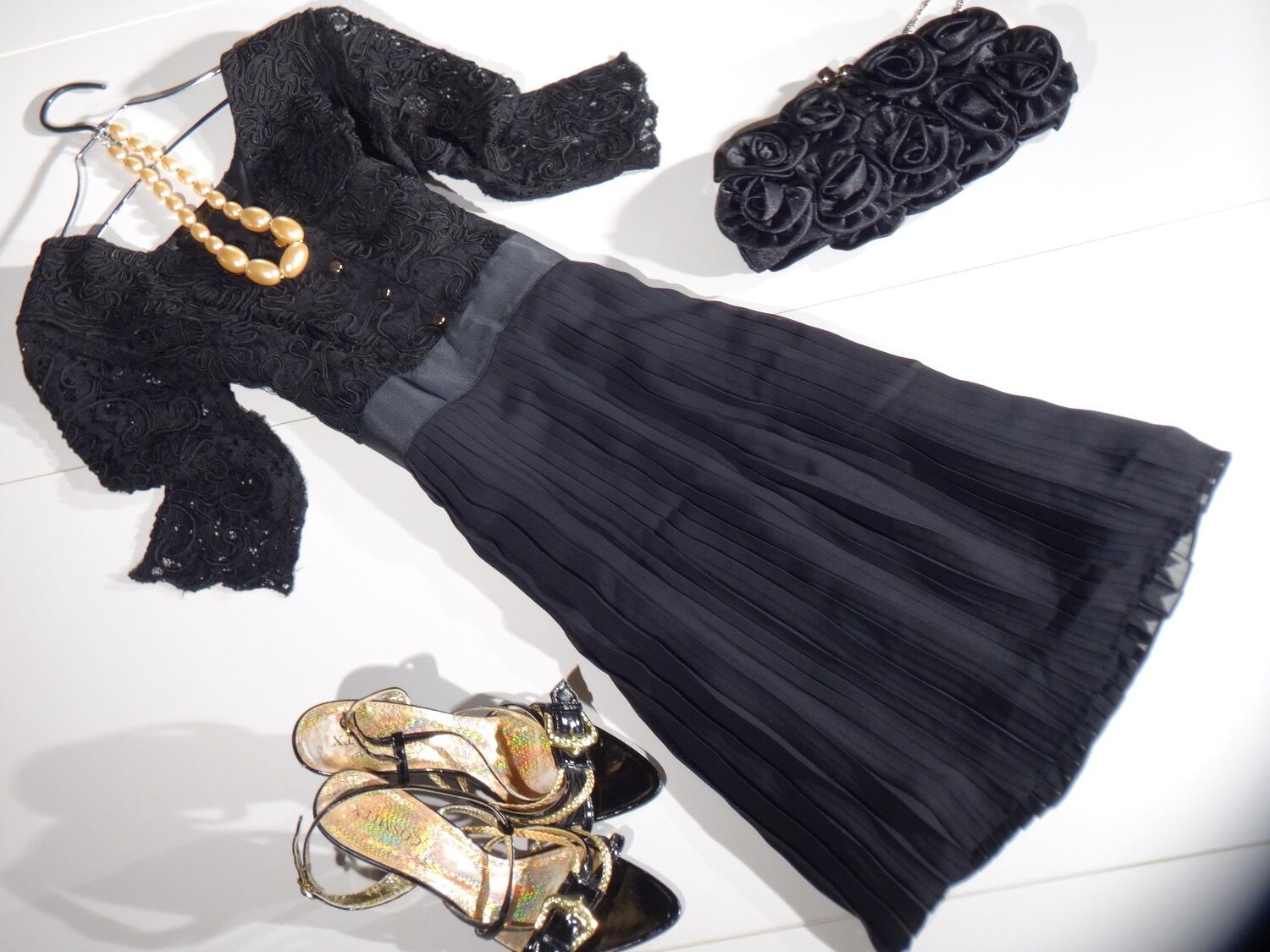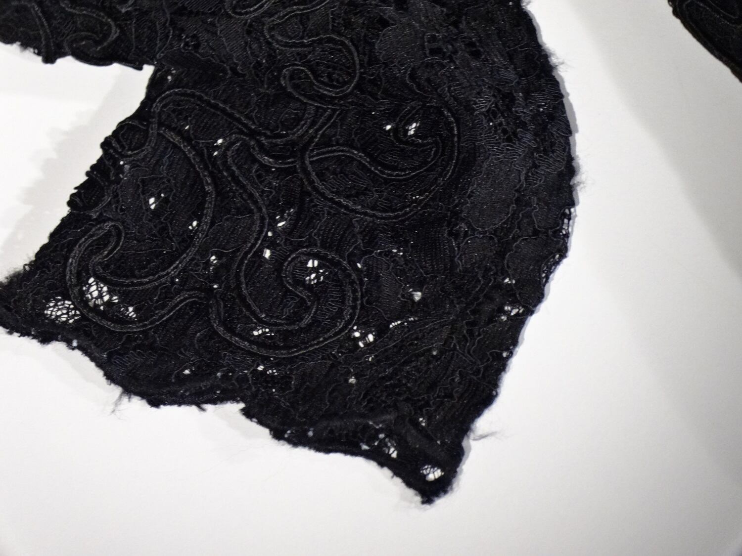 トップスと袖に気品ある花刺繍レースがふんだんにあしらわれたロング丈のワンピース。前身頃には縦にメタルボタンが配され、ウエストから下、ボトムは繊細な1~1.5cm幅のプリーツ仕様になっています。落ち着いた品のある一着です。右脇ファスナー。裏地なし。