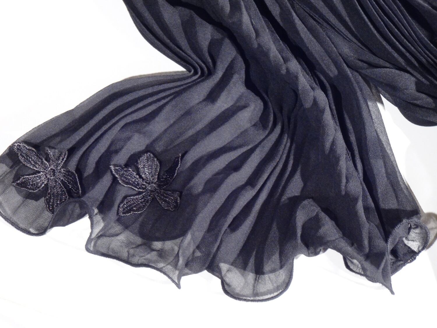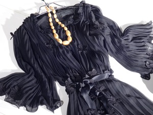 全体的にたっぷりとしたプリーツが、とても大人の女性を表現してくれ又、足元を美しく見せてくれます。どこをとっても飽きの来ない、工夫を凝らした素敵なデザインで大変豪華です。裏地付。ファスナ-有。紐ベルト付。